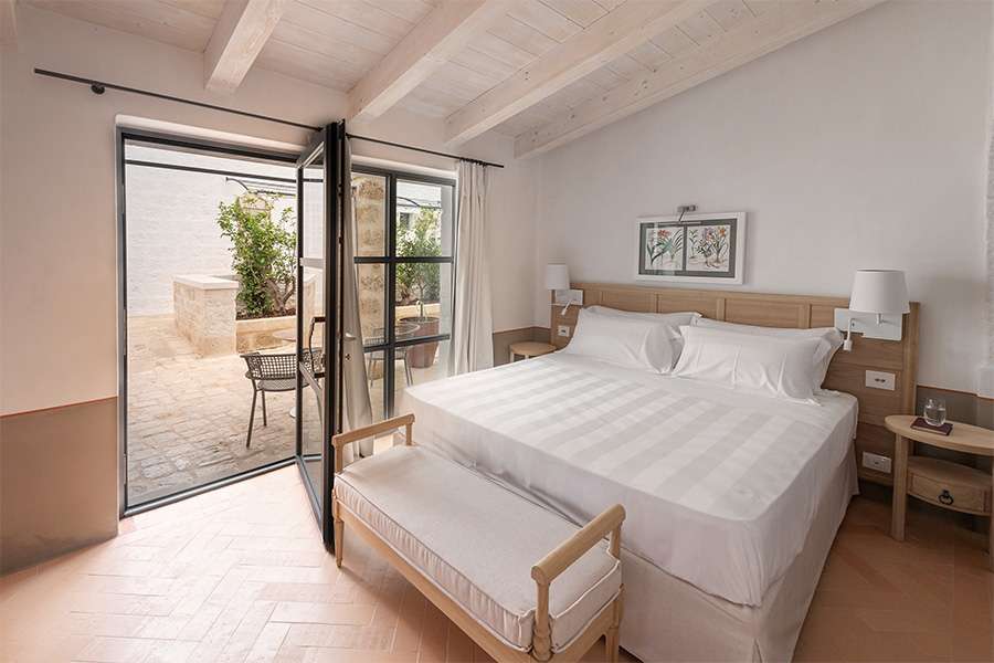 / The room is equipped with a Turkish bath and a private terrace, where you can relax on a comfortable chaise longue. It is accessed by a stone staircase, from which you can enjoy a splendid view.